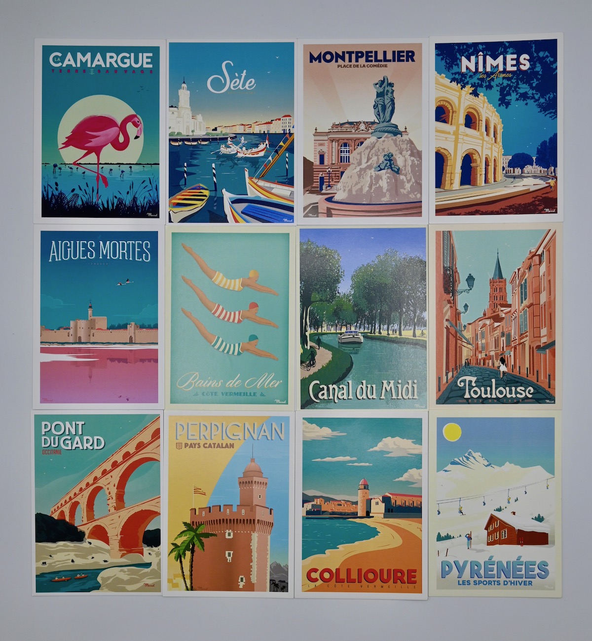 12 cartes postales : Sète, Nîmes, Montpellier, La Camargue, Le Pont du Gard, Toulouse, Aigues-Mortes, Perpignan, Collioure, Le canal du Midi, Les Pyrénées, Bains de Mer.